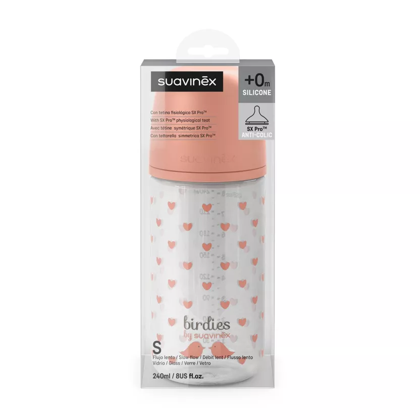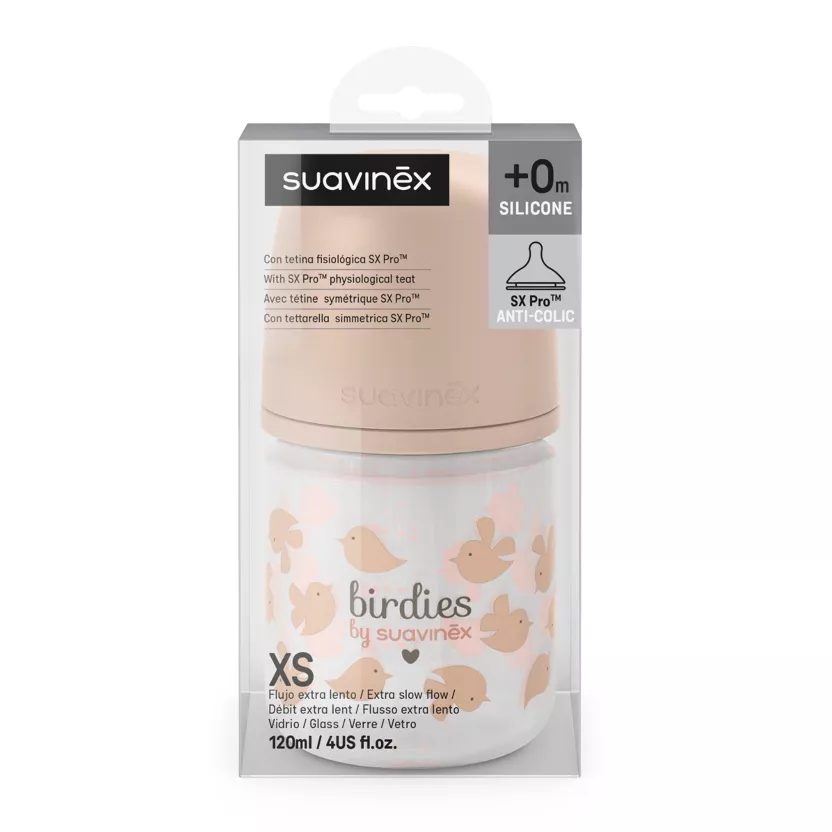 Biberon en verre Suavinex Birdies 240 ml avec tétine SX Pro débit lent Offrez à votre bébé des moments de repas doux et sereins avec le biberon en verre Suavinex Birdies de 240 ml. Son design...