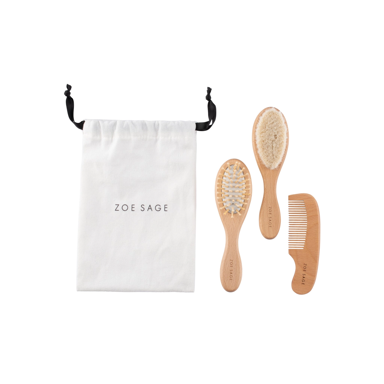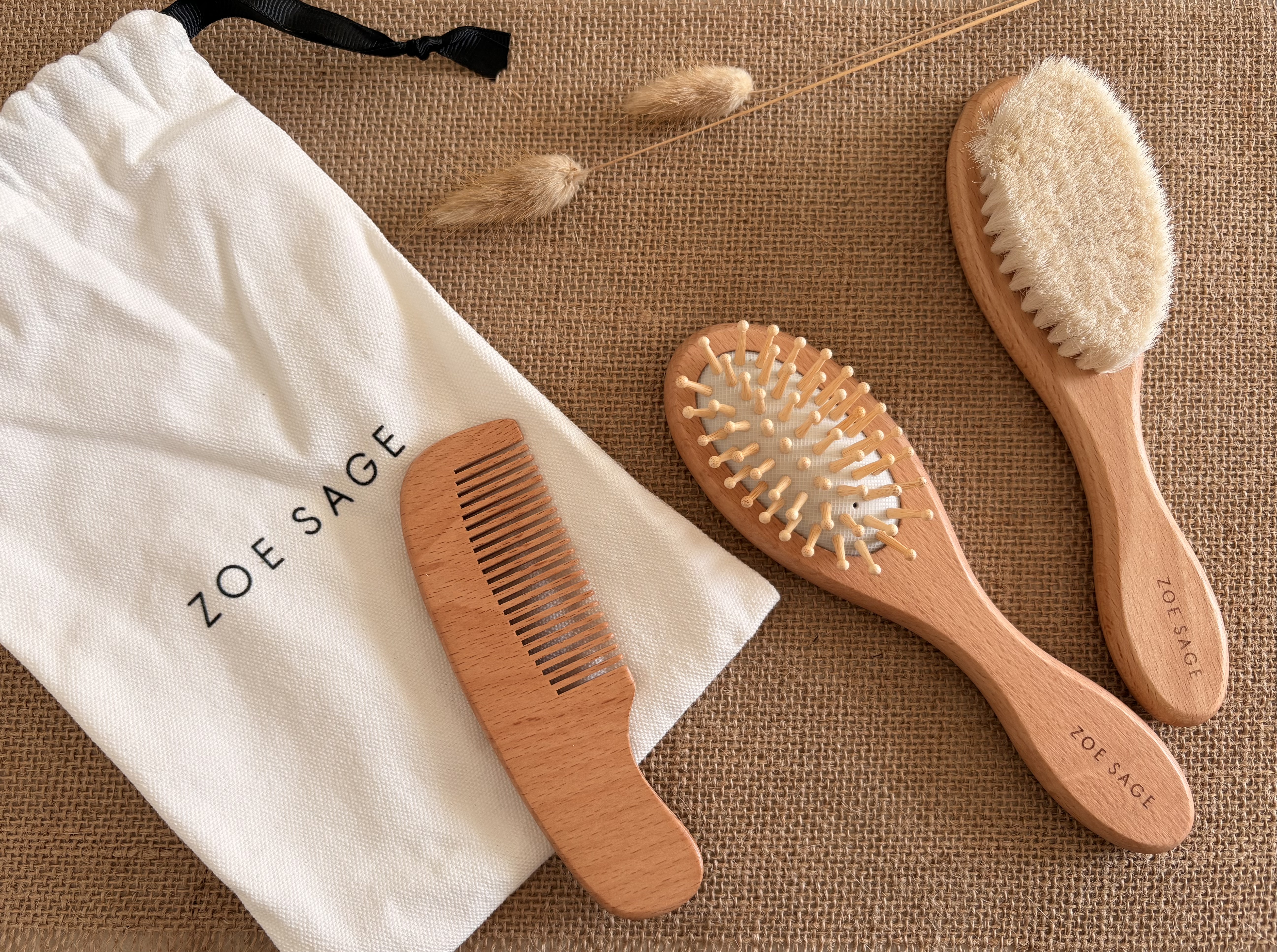 Ensemble brosses et peigne en bois pour bébé - 3 pièces naturelles ultra-douces Fabriqué en bois de hêtre et poils de chèvre ultra-souples, cet ensemble transforme chaque rituel en une expérience...